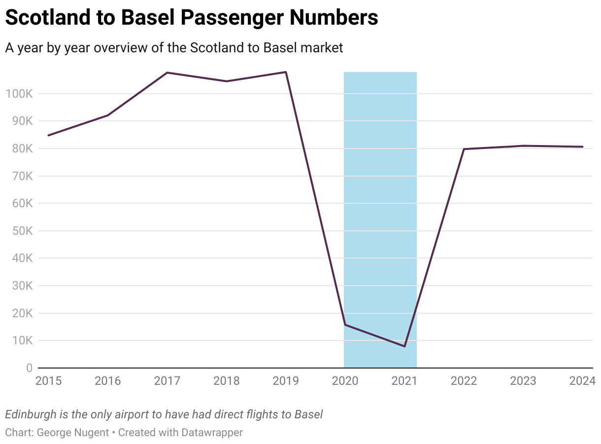 As the above graph mentions, Edinburgh is the only Scottish Airport to have had a route to Basel since 2015. The period highlighted in Blue are the years most impacted by the Covid-19 pandemic.