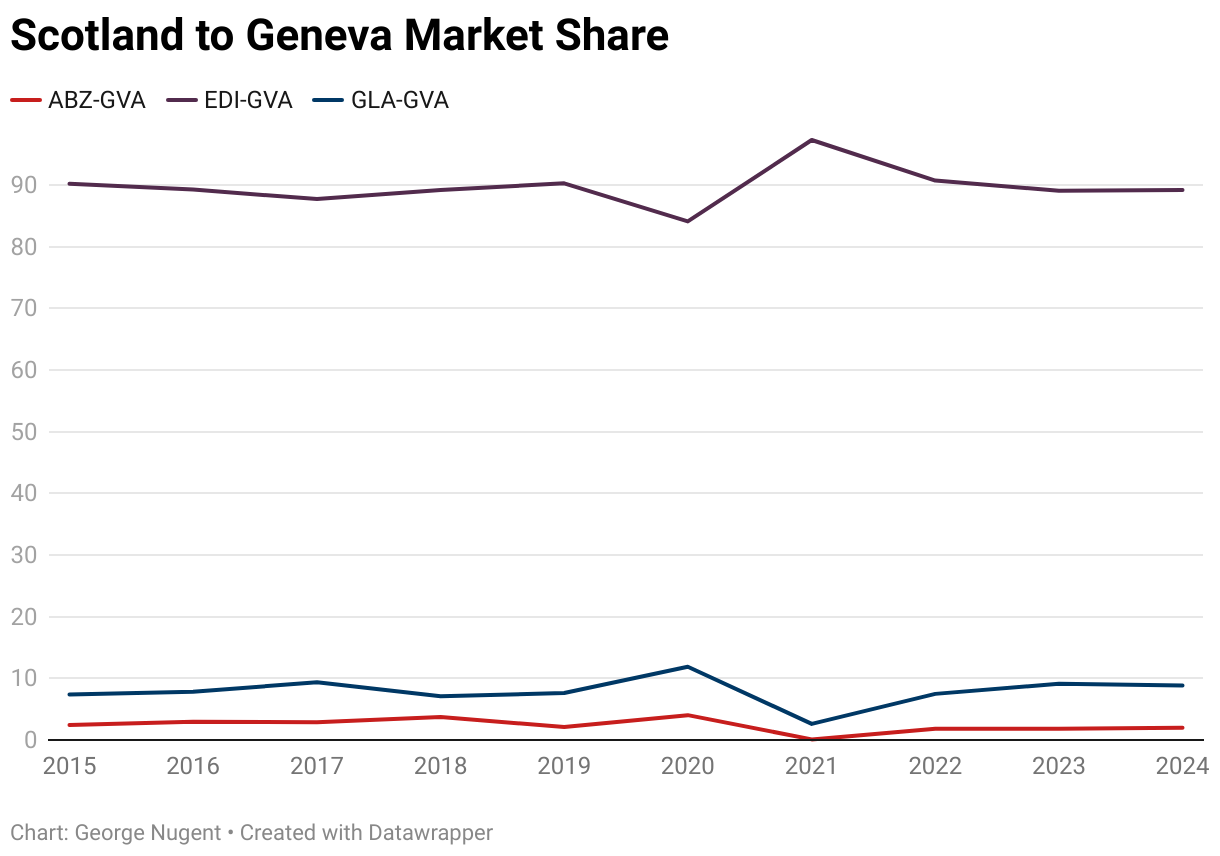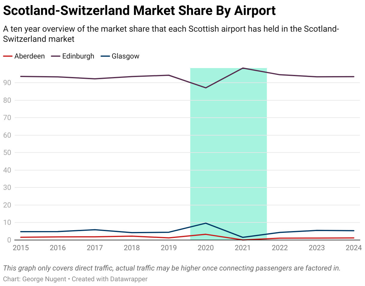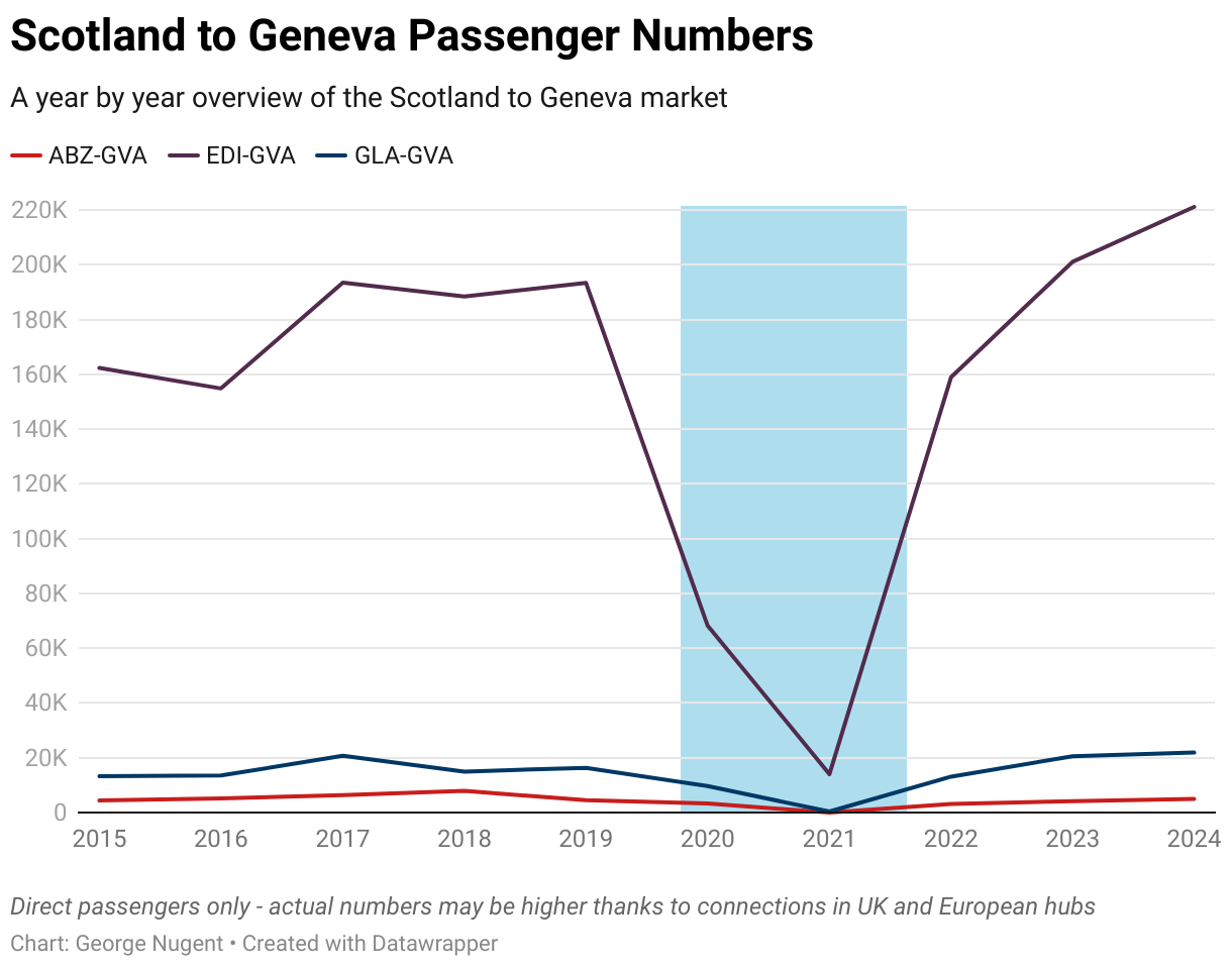 As the above graph mentions, Scotland’s three busiest airports all have service to Geneva. The period highlighted in Blue are the years most impacted by the Covid-19 pandemic.