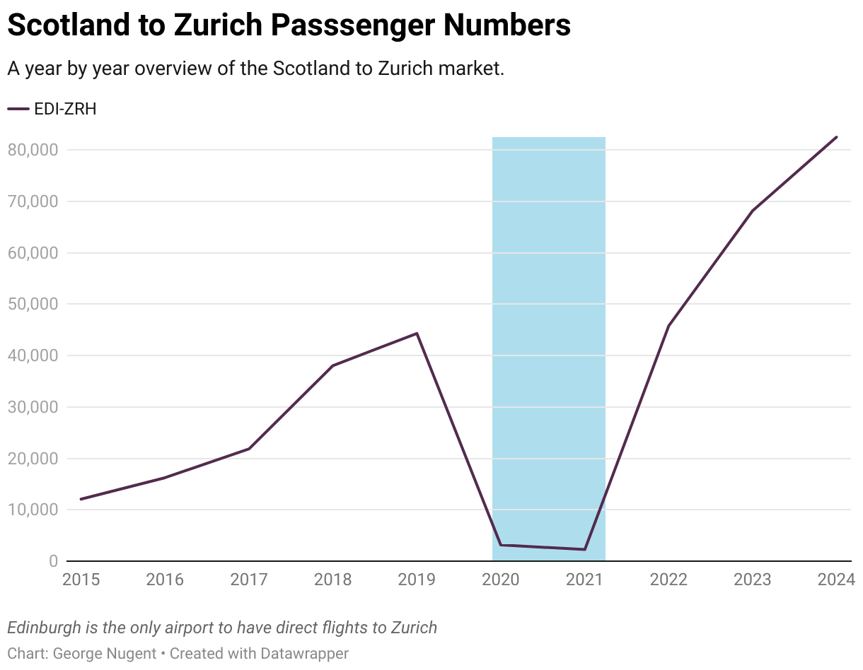 As the above graph mentions, Edinburgh is the only Scottish Airport to have had a route to Zurich since 2015. The period highlighted in Blue are the years most impacted by the Covid-19 pandemic.