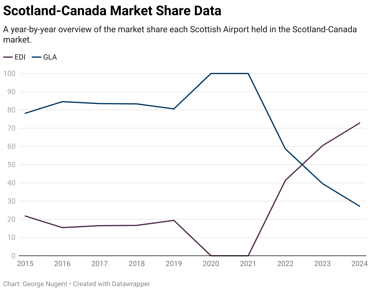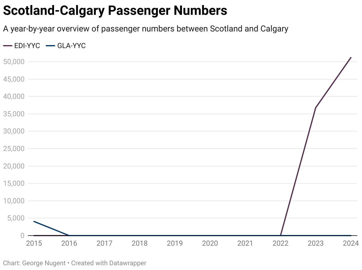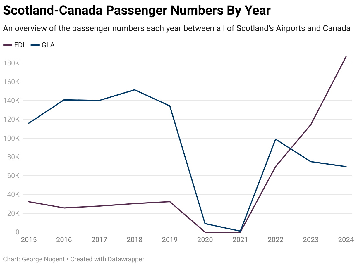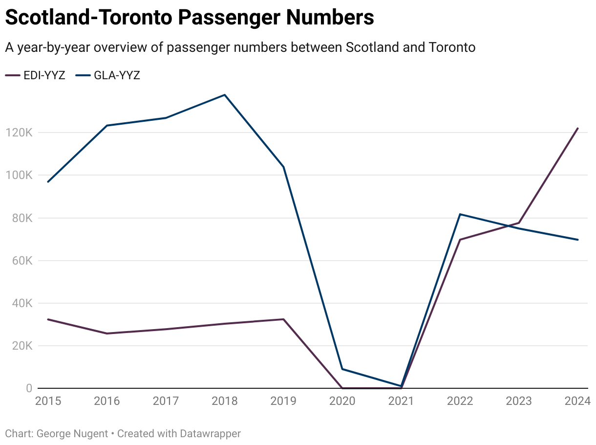 Compare that to 2024 when Air Canada moved their service and combined it with the existing Edinburgh route, WestJet moved their flights to Edinburgh and Air Transat now have increased frequency from Glasgow, but on smaller aircraft.