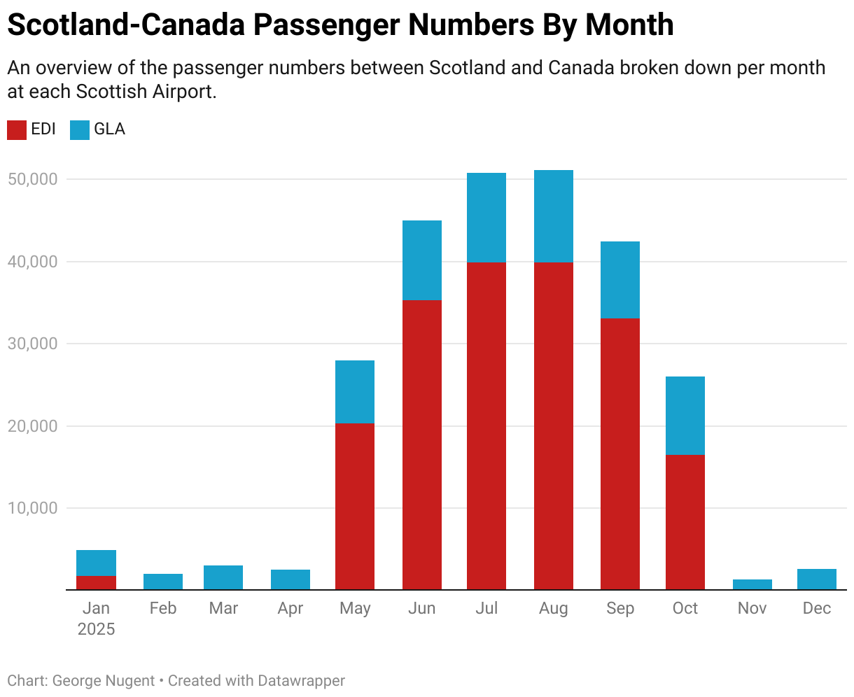 As seen in the graph above, Canada possesses a rather unique trait when compared to the USA, it is year round from Glasgow and seasonal from Edinburgh.