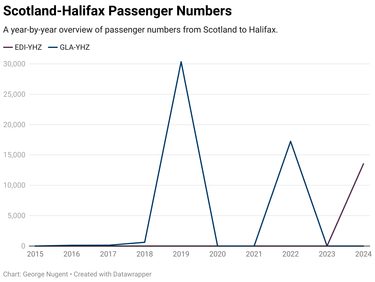 Disclaimer: Although Glasgow Airport did have Halifax flights before the pandemic, these were actually a technical stop on the way to Toronto, therefore passenger numbers are not very high, for the best comparison between Glasgow and Edinburgh use 2022 figures, as flights from Glasgow were offered as a non-stop dedicated service!