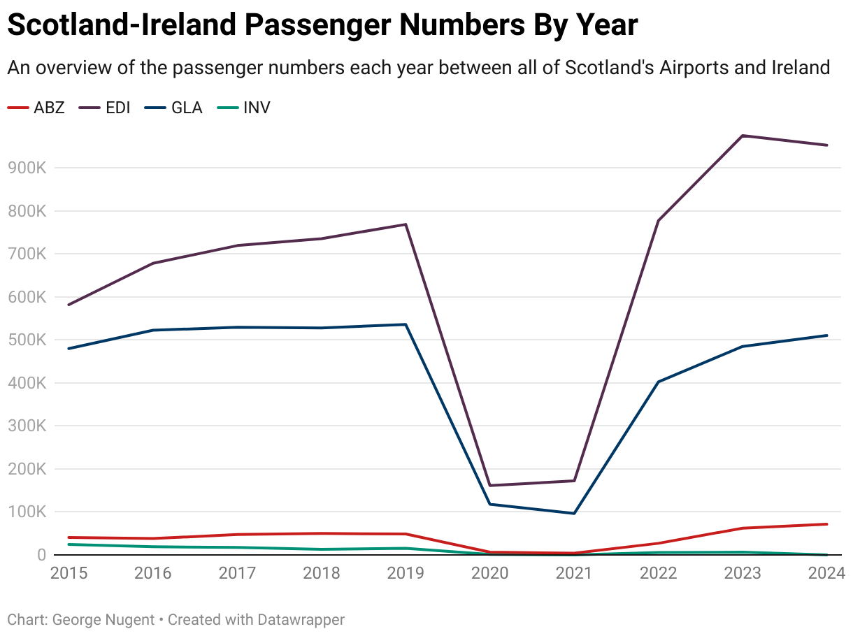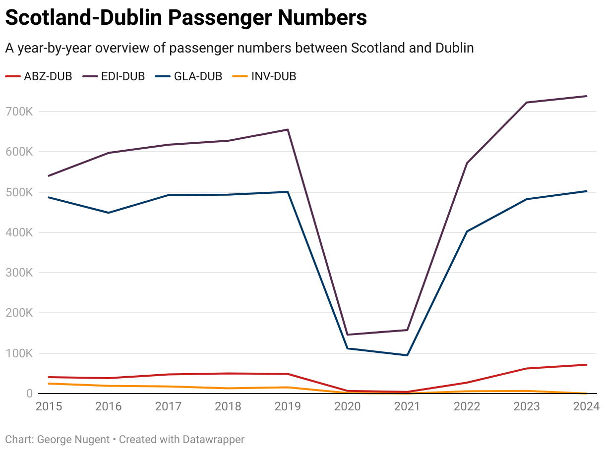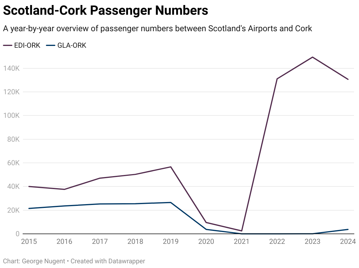 As a result of Ryanair operating the Edinburgh route and not Aer Lingus, it has ultimately allowed passenger numbers on that route to soar, but, 2025 will need to finish in order to see how the Glasgow route impacts (if it even does) the Edinburgh flights.