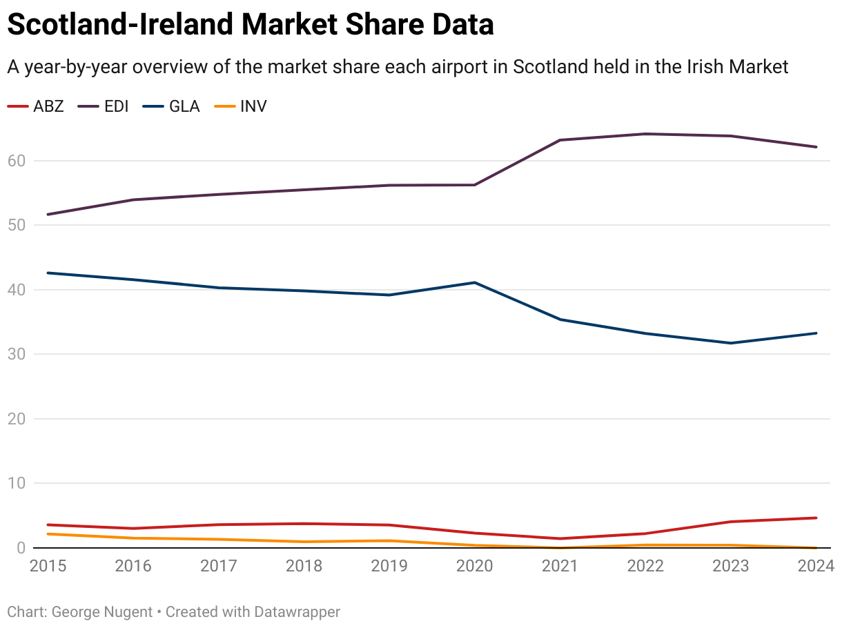 In 2024, Aberdeen held 4.65% of the Irish market, Edinburgh held 62.09% and Glasgow held 33.25%.