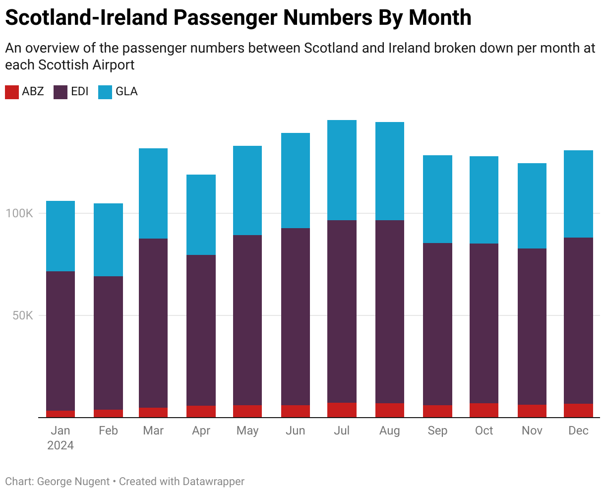 Passenger numbers between Scotland and Ireland typically remain stable throughout the year, with the two countries benefiting from a distinctive lack of seasonality between them.