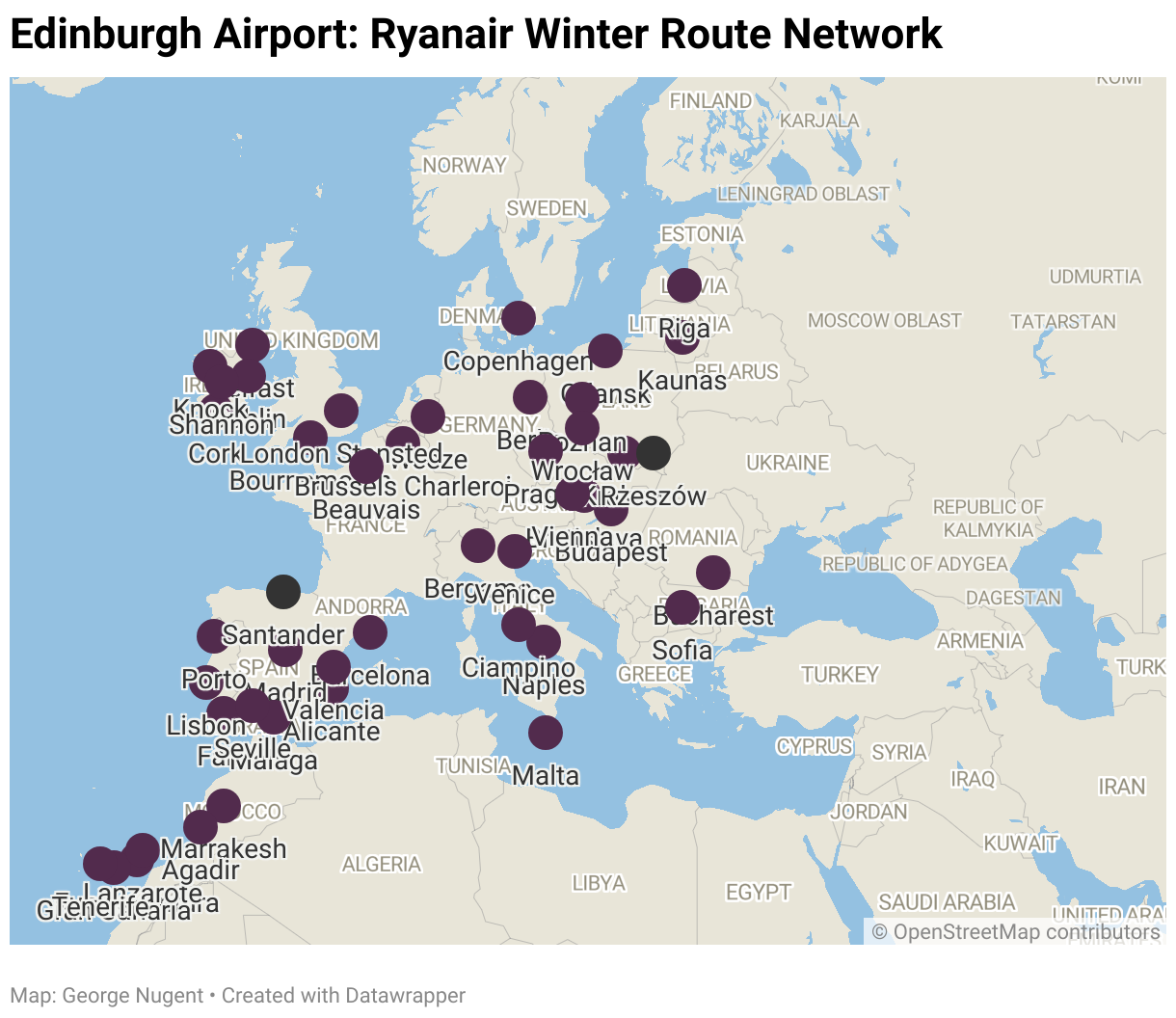 Perhaps least surprising of these increases is Budapest, with both Budapest and Edinburgh now being part of the Vinci Airport network, and WIZZ Air ending its Glasgow service it appears Ryanair is banking on the sudden drop in capacity from Scotland – however, these additional two flights do not provide an equal replacement in capacity thanks to the significantly higher capacity of WIZZ’s A321’s