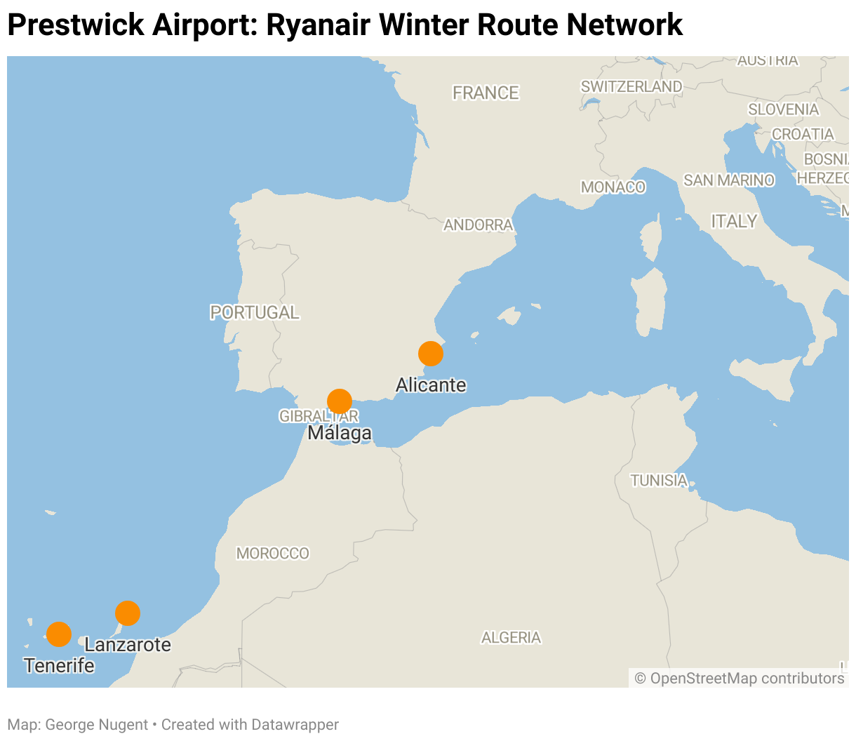 Based on the initial schedule, Prestwick Airport will not see any new routes, but rather expansion on some of its existing routes. The airline will serve 4 destinations, all of which are in Spain, with a reduction in one destination when compared to Winter 2024.