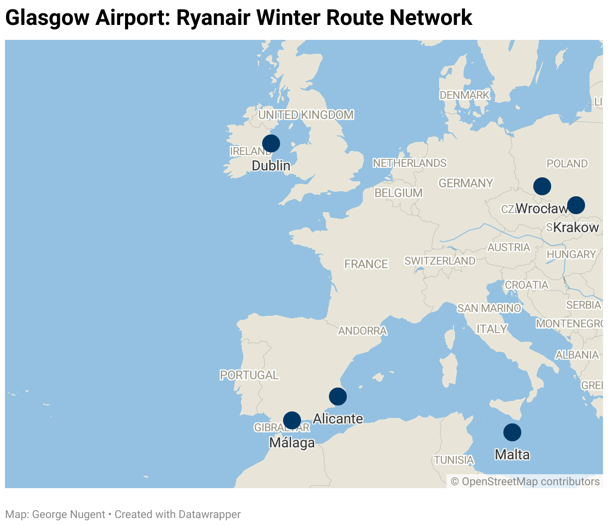 Ryanair continues, unusually, to grow from Glasgow Airport, with the airline serving 6 destinations across 4 countries, an increase of 1 for each category on last year. Ryanair has also added flights on some existing routes to further boost capacity.