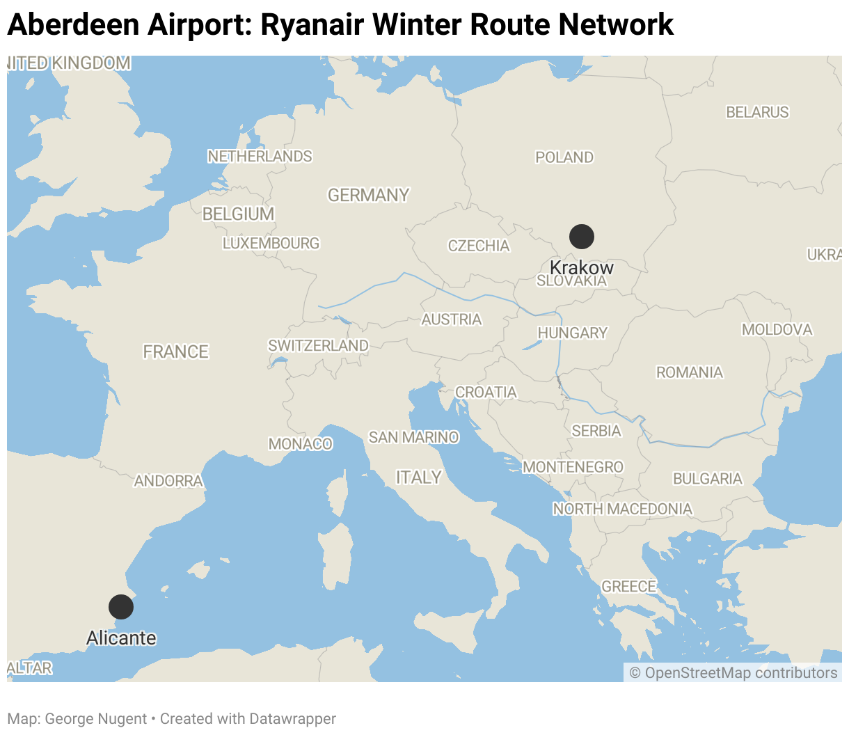 Ryanair will once again resume winter operations from Aberdeen, having suspended them for W24/25. The airline will convert two routes from summer seasonal to year-round and will operate 5 flights per week.