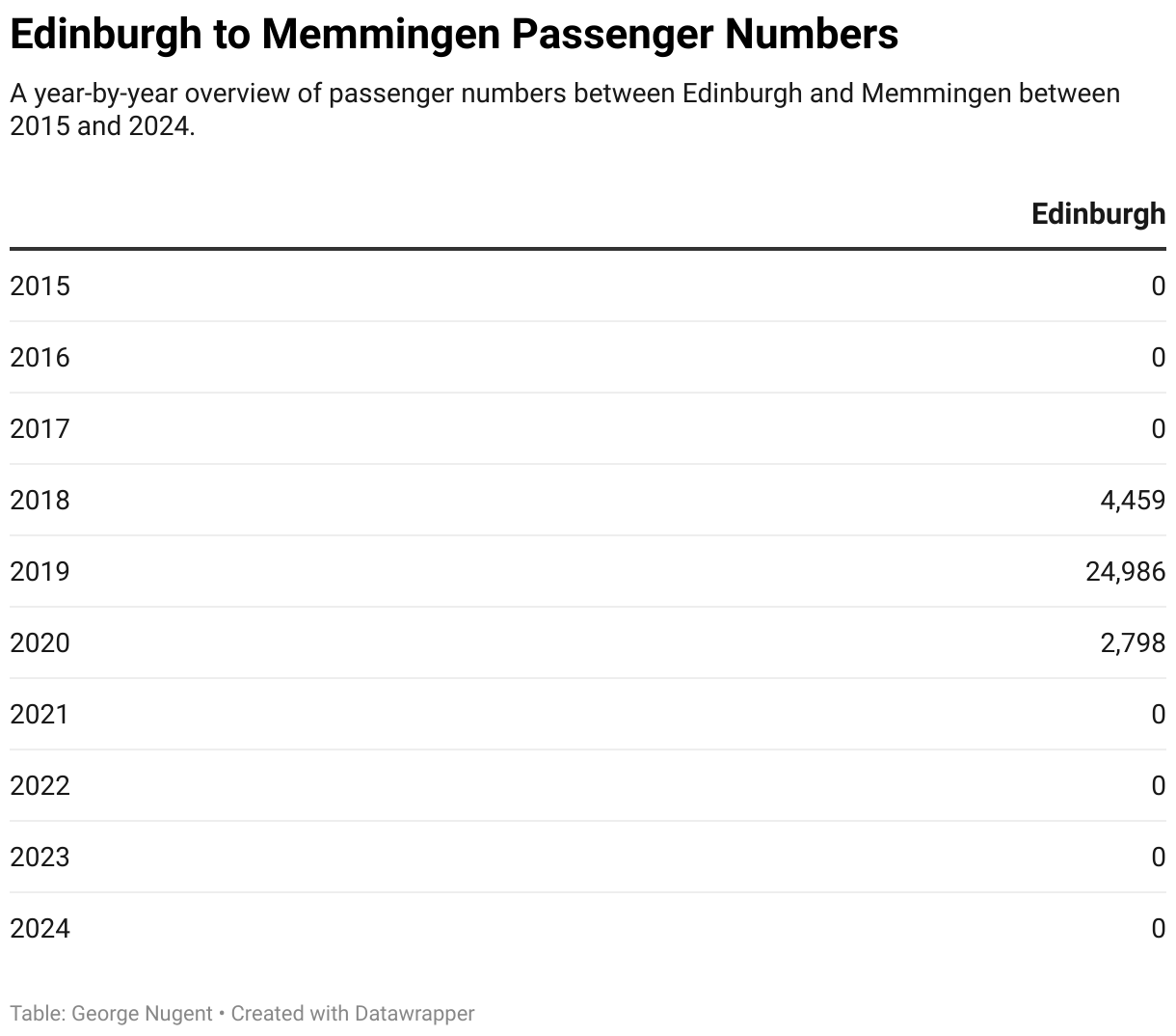 Flights between Edinburgh and Memmingen were operated by Ryanair and operated until 2020. Since these flights stopped operating no other airline has taken over the service, and looking to the rest of 2025, no airline has announced plans to take over the route.