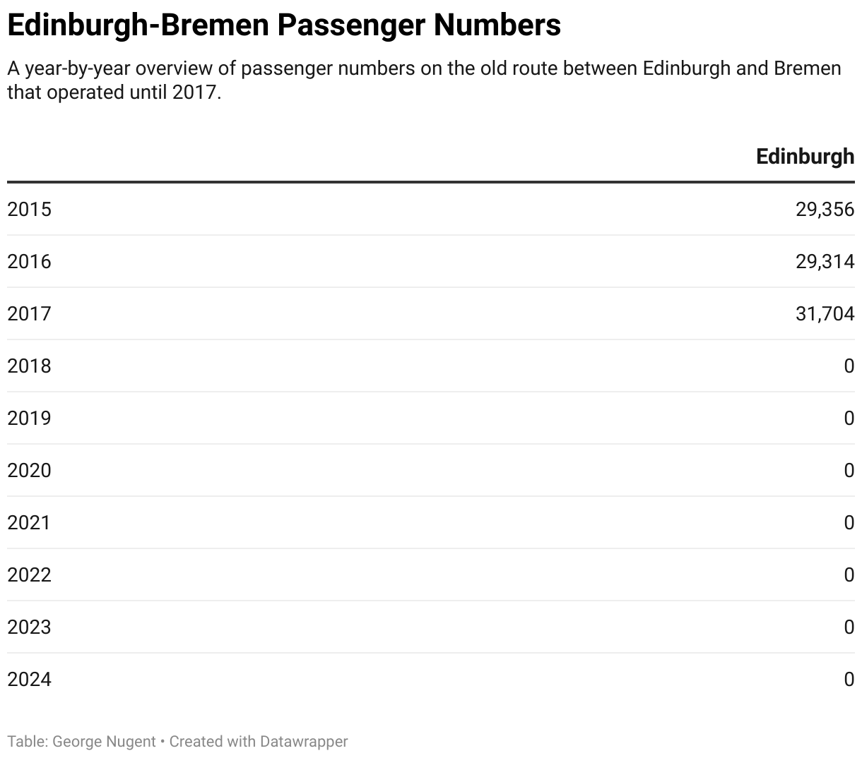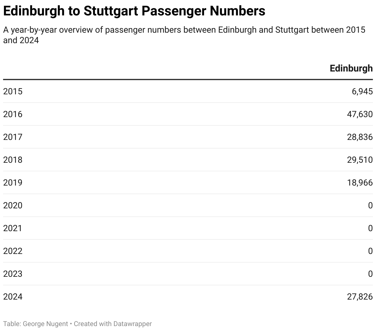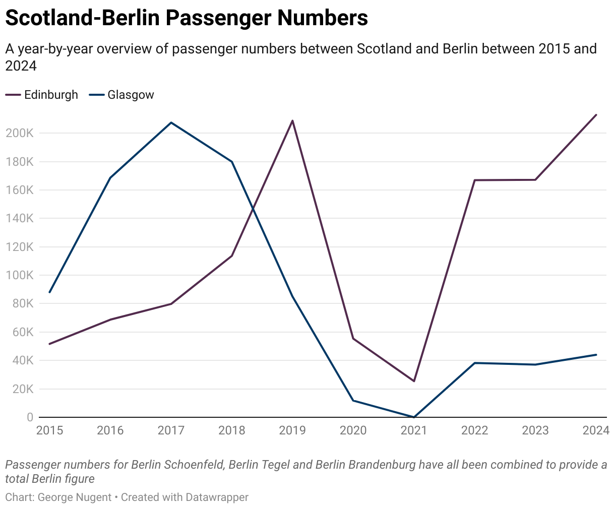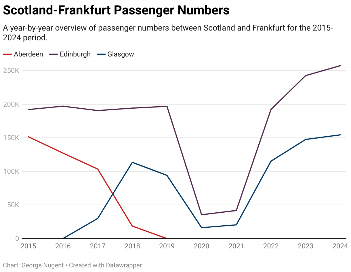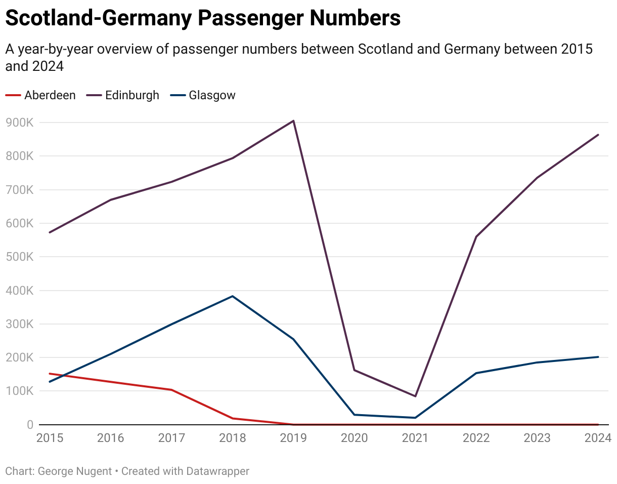 This section contains information on passenger numbers on routes that have operated between Scotland and Germany that has operated at any point between 2015 and 2024, with information on airlines where possible.