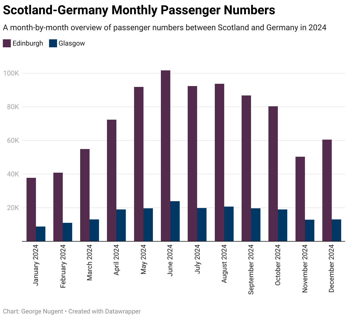 Second disclaimer is the very presence of the Euros tournament in June and July which significantly boosted passenger numbers during those months, therefore, 2024 is not the best year for drawing conclusions about demand between Scotland and Germany, but the impact of the Euros will likely be felt in the years to come with the positive reception Scotland fans received in Germany likely to increase bookings in both directions.