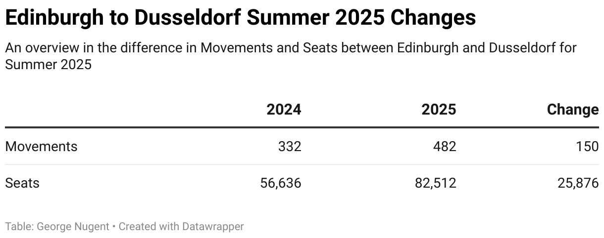 Although no airlines have announced flights from Glasgow I should point out that AGS who owns Glasgow Airport has recently been acquired by AviAlliance who owns a 30% stake in Dusseldorf Airport (AviAlliance Corporate Presentation – Q2 2025). It will be interesting to see if this new ownership can attract an airline to operate a route between Glasgow and Dusseldorf.