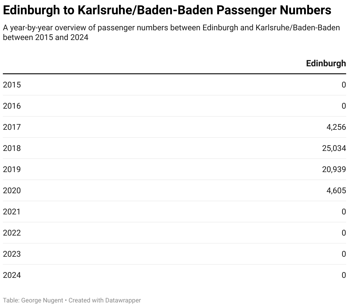 Flights between Edinburgh and Karlsruhe/Baden-Baden were operated by Ryanair and operated until 2020. Since these flights stopped operating no other airline has taken over the service, and looking to the rest of 2025, no airline has announced plans to take over the route.
