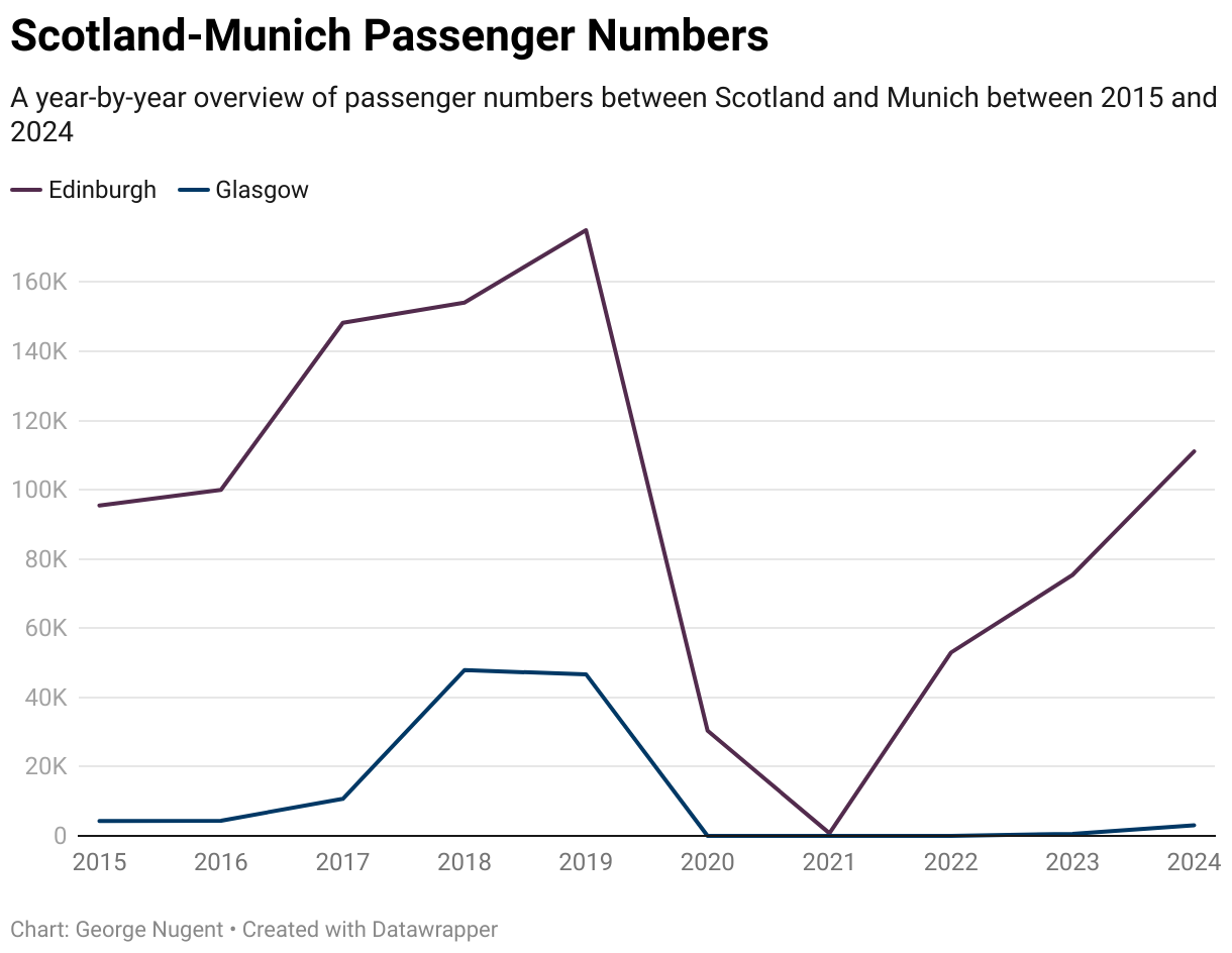 Munich remains another destination in Germany that has seen a consolidation of service at Edinburgh Airport, but despite this, passenger numbers remain significantly below 2019 levels at both a national and local level.