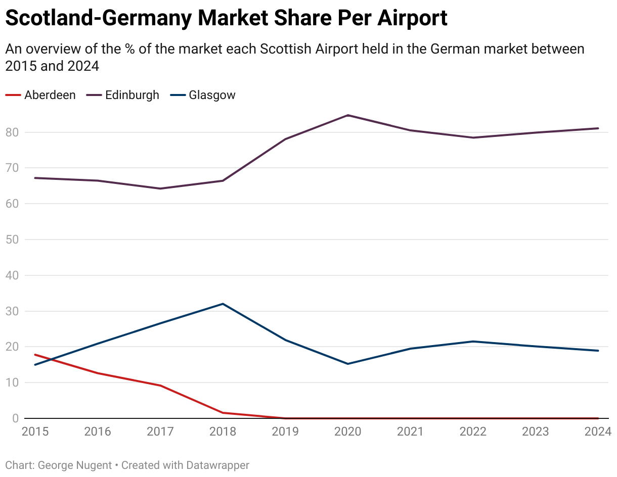 Passenger numbers between Scotland and Germany were operating at 91.85% of 2019 levels, however, this has not been spread equally across each airport in Scotland, rather, flights have consolidated in Edinburgh and Glasgow, with Aberdeen having long lost its German flights with Lufthansa, and there does not appear to be a clear airline or route that would likely return to the network in the near future.