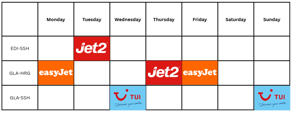Please note that as of the time of publication easyJet has not placed Glasgow to Sharm El Sheikh on sale for easyJet Holidays bookings, assuming the same days of operation as 2026 it would operate on Wednesday and Saturday.