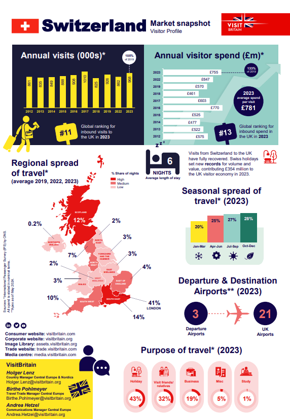 - 23% of spend by visitors from Switzerland came from business travellers, significantly higher than the market average of 18% (Visit Britain).