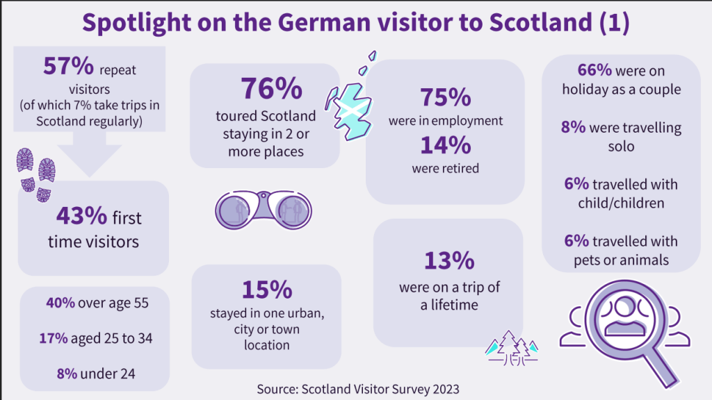 Germany remains the 2nd largest international source makret of tourism to Scotland, beat only by the USA, and accounts for 9% of overseas spend in Scotland. I have included some screenshots with additional information on the German tourist market to Scotland.